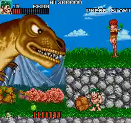 Caveman Ninja (known as Joe & Mac outside Japan) is a beloved side-scrolling platformer arcade game from 1991 that throws you into a prehistoric adventure. Players control either Joe or Mac, two cavemen on a quest to rescue their cavewomen from a rival neanderthal tribe and a host of quirky dinosaur enemies, delivering classic co-op mayhem.